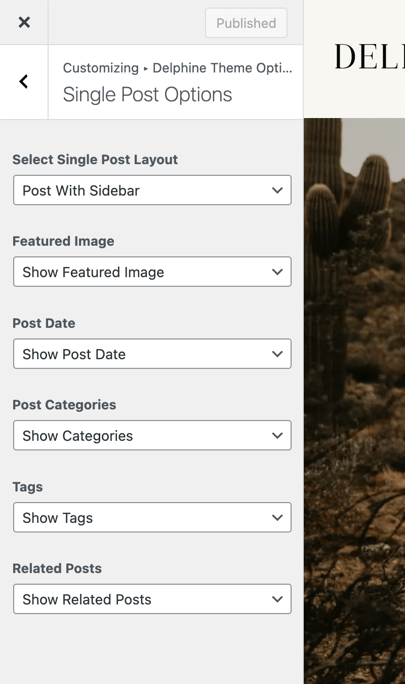 To customize the layout and display options for Single Posts, navigate to Appearance > Customize and click on Delphine Theme Options. On the next screen, click on Single Post Options.