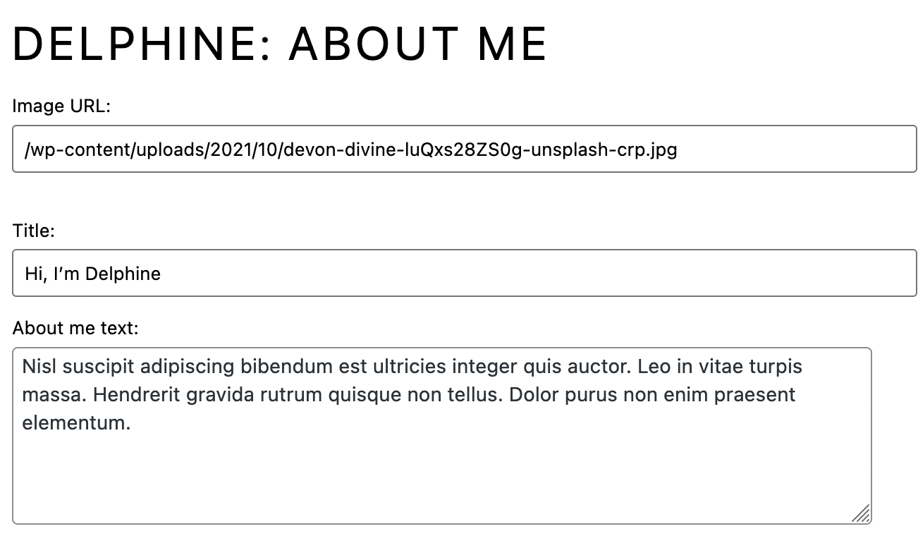 Displays an "About Me" widget. You can add a title, image, and custom paragraph text. The image below shows the settings used in the theme demo. To get the Image URL of your preferred About Me image, go to Media > Library. Click on the image, and click the "Copy URL to clipboard" button from the image details on the right of the screen.