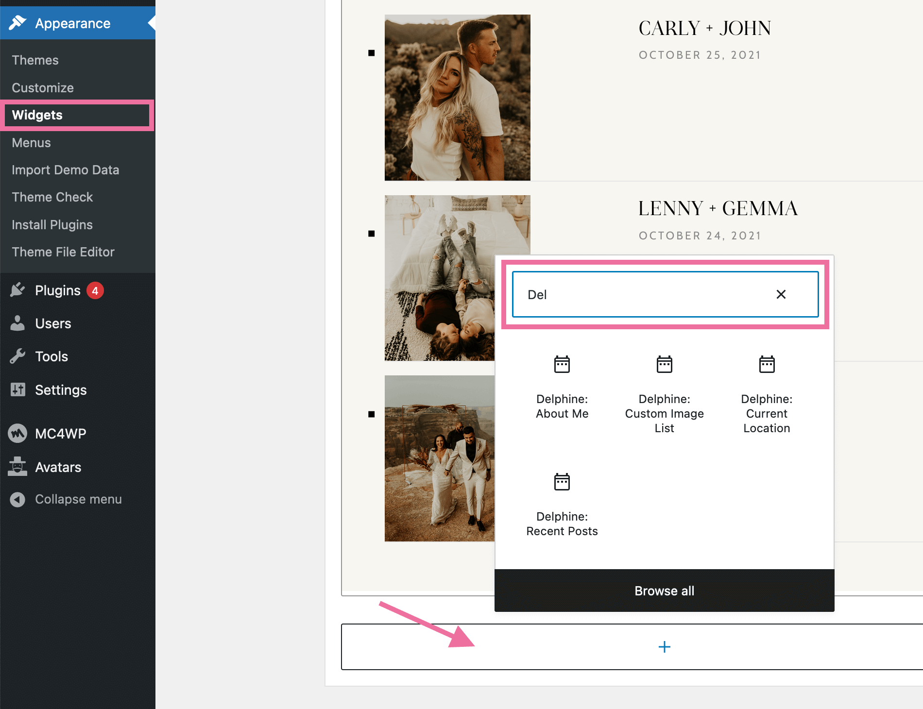 From the WordPress Dashboard, navigate to Appearance > Widgets to add widgets to the WordPress sidebar. As shown in the screenshot below, click on the + icon to add new widgets. Enter in "Delphine" to the search bar to find the theme widgets.