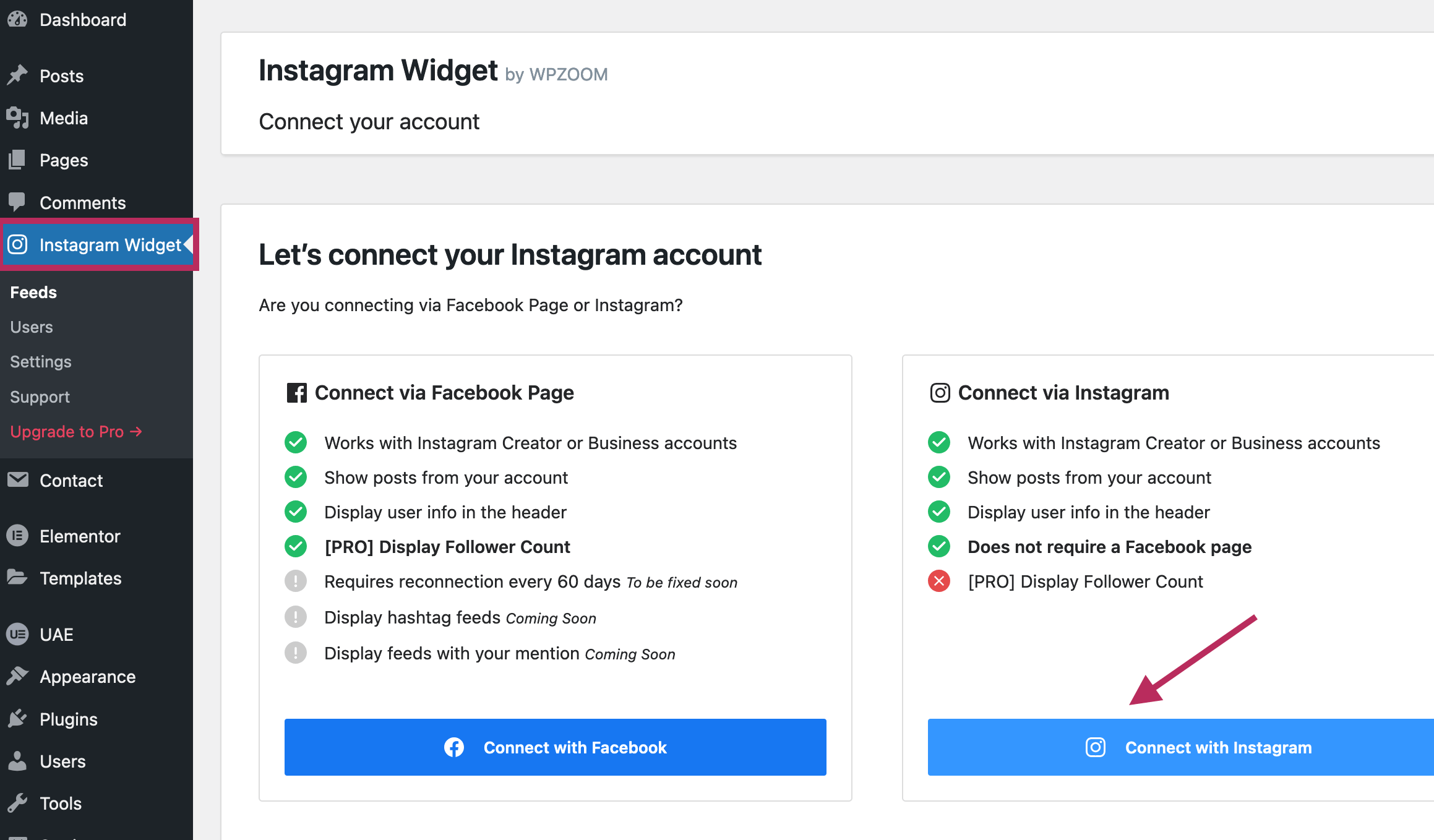 To configure the plugin, from the WordPress Dashboard, click on the Instagram Widget tab. As shown in the image below, click on the Connect with Instagram button to connect your Instagram account to your WordPress website.