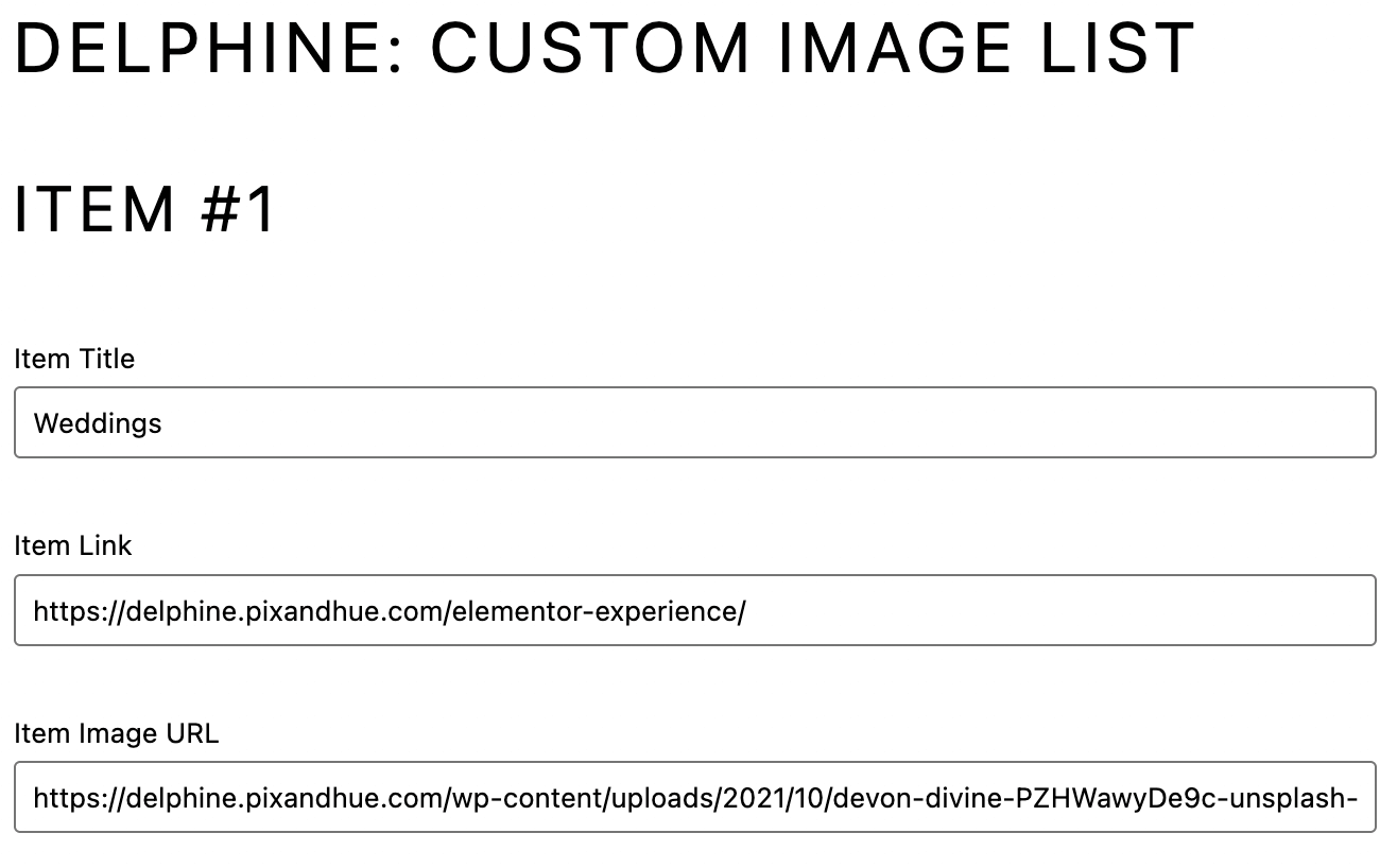 Displays a custom image list of up to 5 items, including a custom background image, title, and link. The image below shows the settings used in the theme demo. To get the Image URL for each list tem, go to Media > Library. Click on the image, and click the "Copy URL to clipboard" button from the image details on the right of the screen.