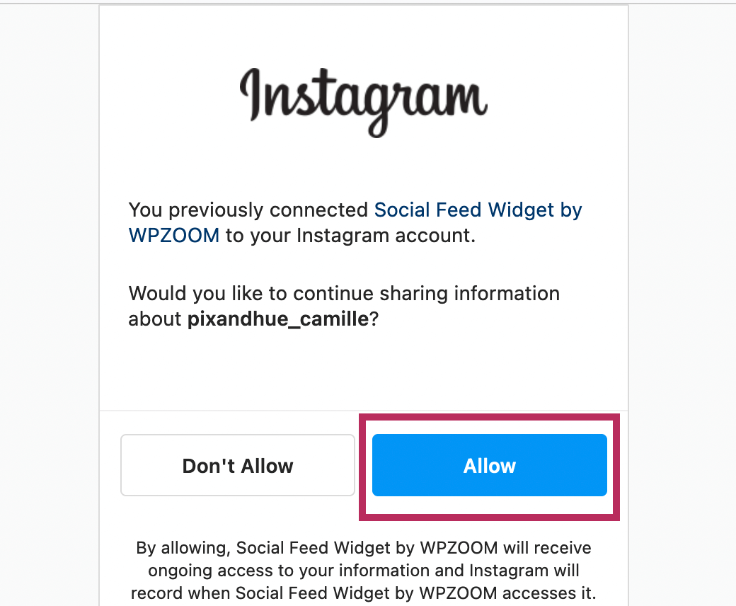 After logging into Instagram, you will be will be prompted to allow the plugin permission to access your Instagram feed. As shown in the screenshot below, click the blue "Allow" button.