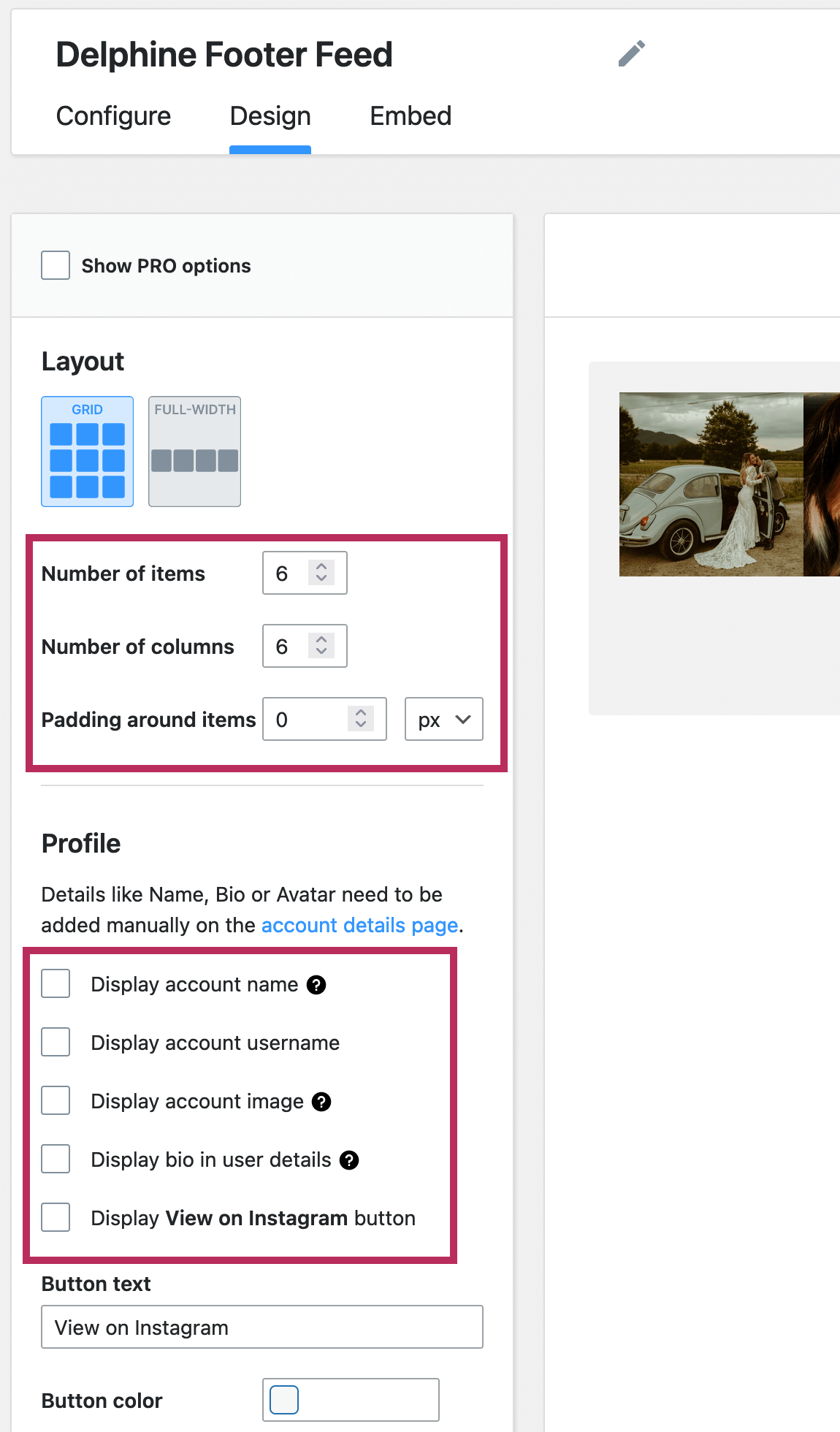 To create an Instagram feed, click on the Design tab. Use the settings menu on the left of the screen to design a feed for your own website. The screenshot below shows the settings used in the Footer of the theme demo.