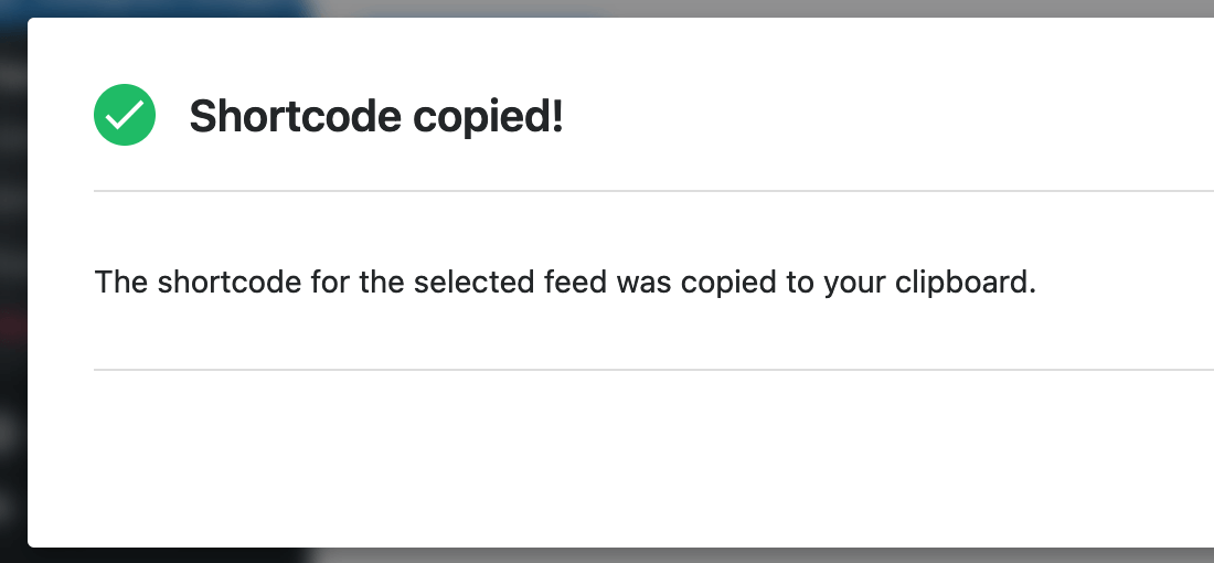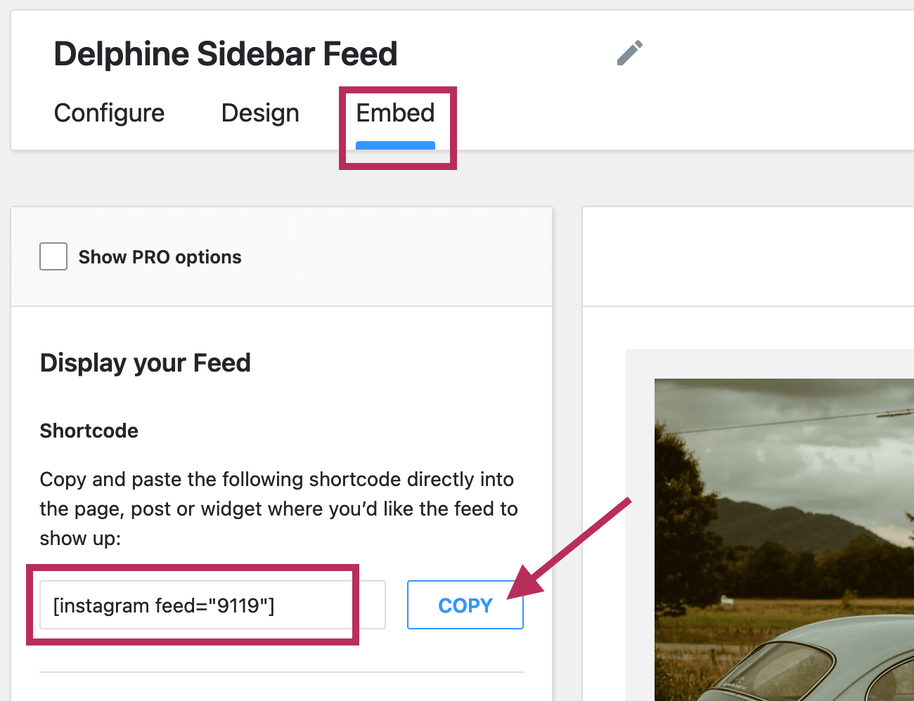 Next, navigate to the Embed tab. As shown in the screenshot below, click the Copy button to copy the WordPress shortcode for this Instagram feed.