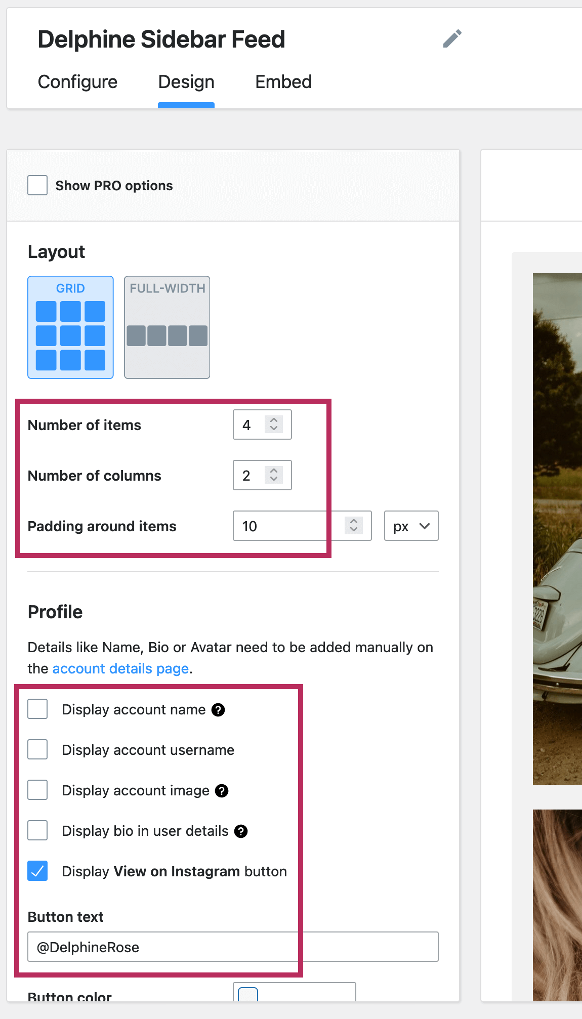 To create an Instagram feed, click on the Design tab. Use the settings menu on the left of the screen to design a feed for your own website. The screenshot below shows the settings used in the Sidebar of the theme demo.