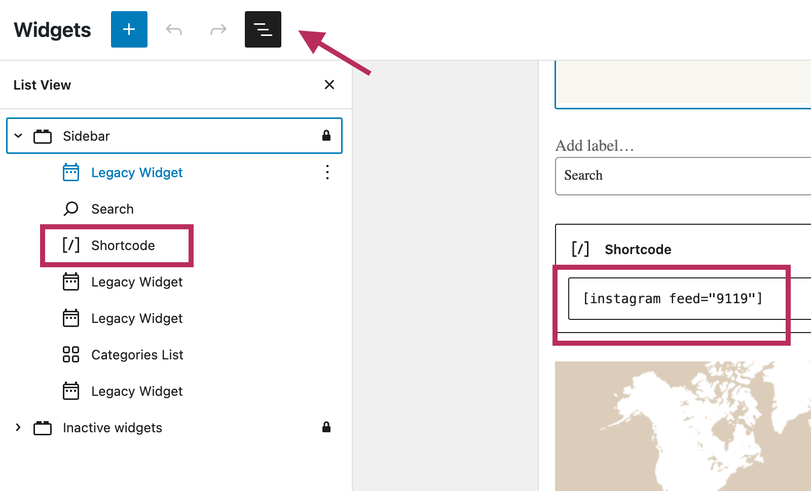 Finally, use the WordPress shortcode block to add the Instagram feed to your sidebar.