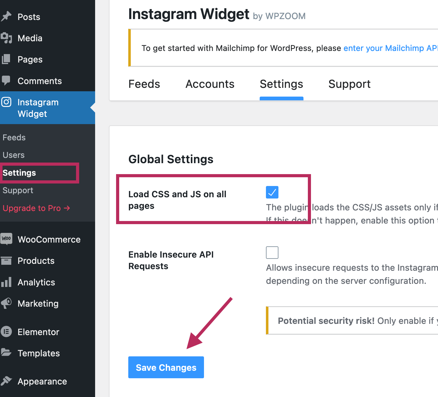 For the final step in setting up Instagram on your website, navigate to Instagram Widget > Settings. Check the box for Load CSS and JS on all pages. Click on the blue Save Changes button to complete the setup of the Instagram plugin.