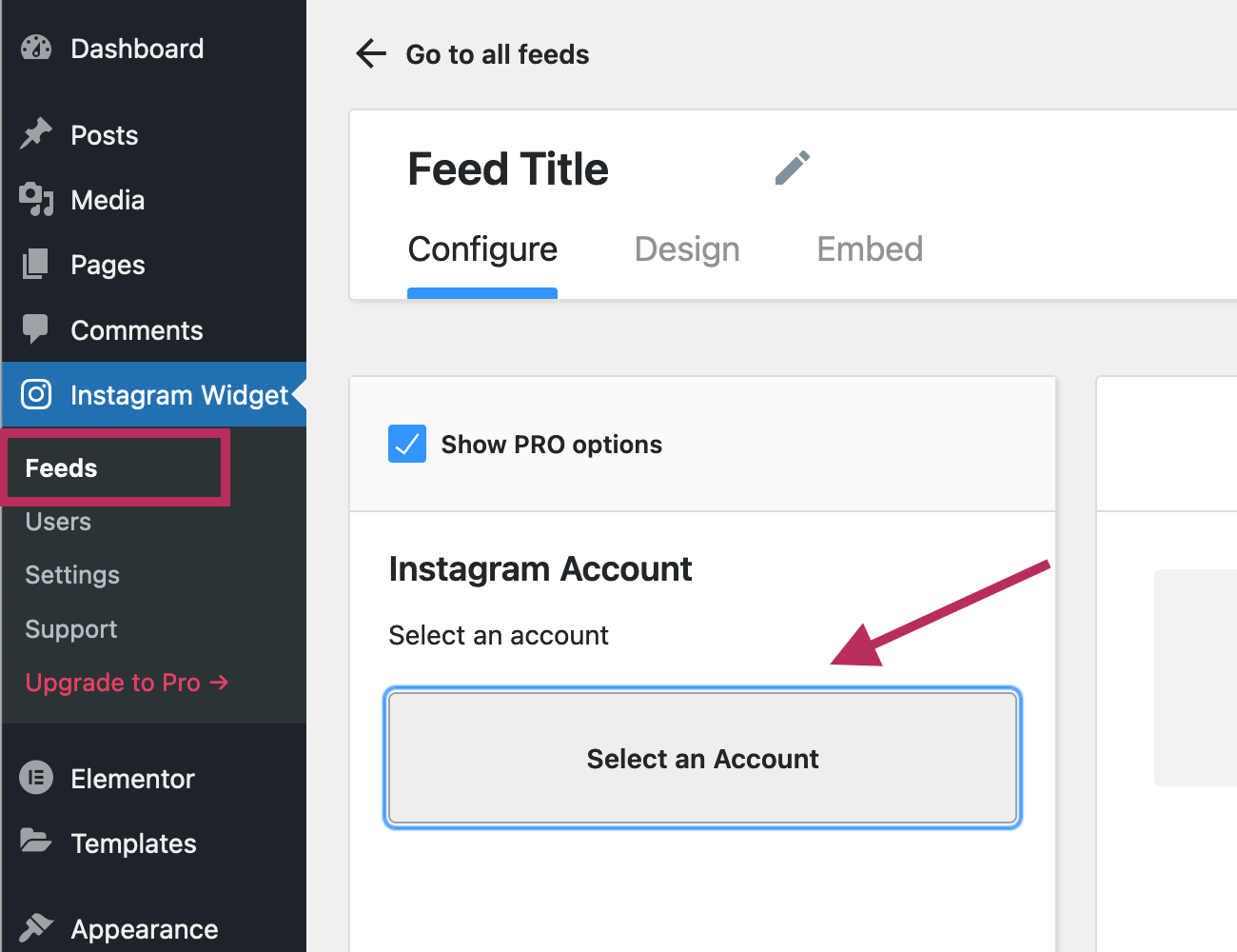 After connecting to your Instagram account, you will be redirected to the Feeds page. As shown in the screenshot below, on the left of the screen, click on the Select an Account button to continue forward.