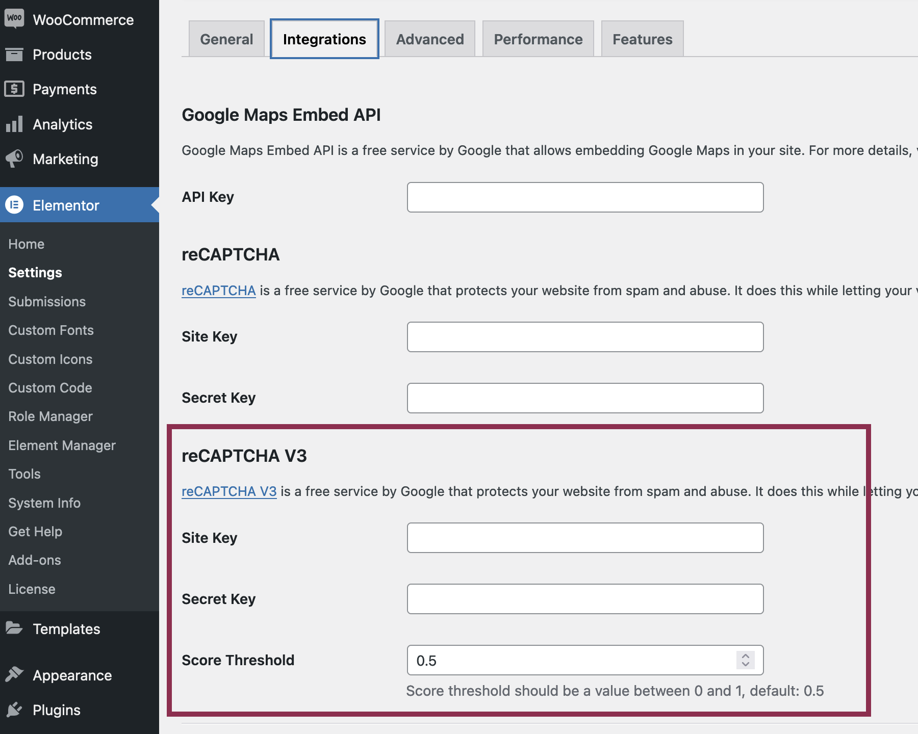 Now that you have registered your website with Google reCAPTCHA, let’s switch over to the WordPress Dashboard. Please make sure you have easy access to the Site Key and Secret Key. You will need to add them into the Elementor settings.